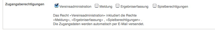 Der Vereinsadministrator kann anschließend ausgewählten Mitgliedern (z.B. Mannschaftsführern) die Zugriffsberechtigung »Ergebniserfassung« erteilen, er kann aber auch die Administrationsberechtigung an ein anderes Mitglied abgeben. Diese Mitglieder müssen dieselben Voraussetzungen wie der Vereinsadministrator erfüllen.